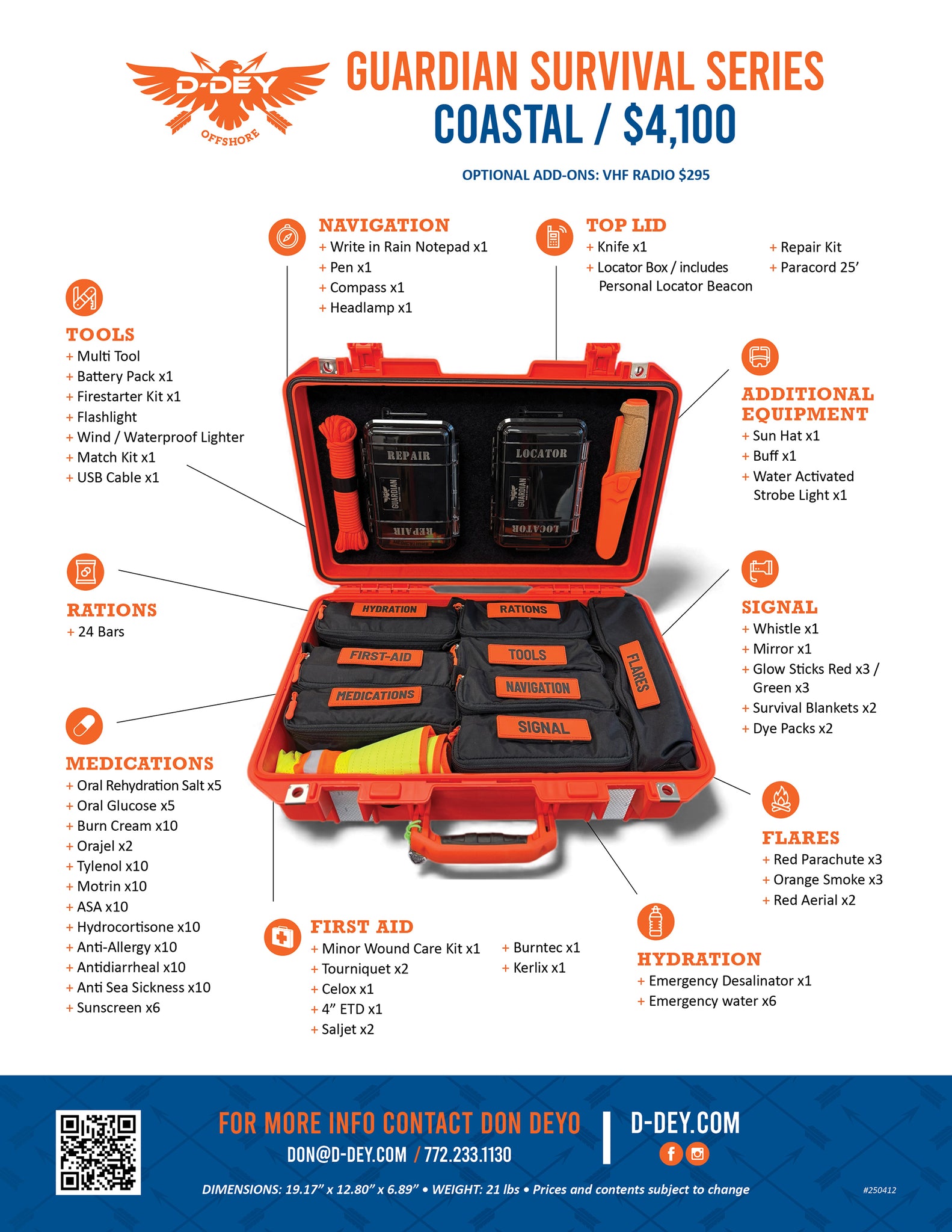 Housed in a heavy-duty, watertight Pelican™ case measuring 19.17” x 12.80” x 6.89” and weighing approximately 21 pounds, this mission-configured system integrates essential capabilities for extended time at sea. The kit combines life-sustaining hydration solutions, medical and trauma care, signaling and location tools, shelter components, nutrition, and critical repair items—each selected to perform reliably in demanding marine environments.